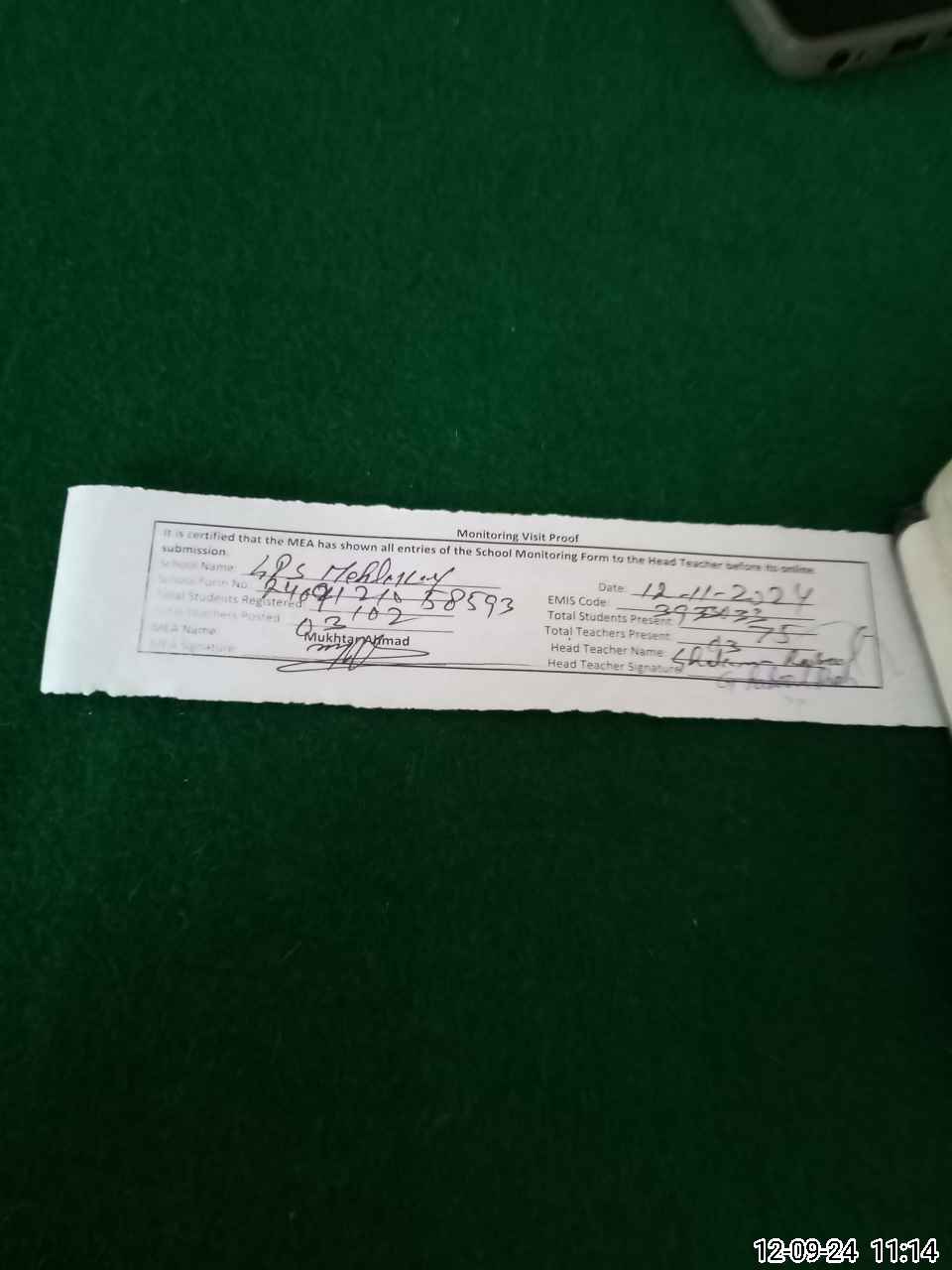 | Monitoring Date: 12-09-2024 | Start Time: 12-09-2024 10:58 AM | End Time: 12-09-2024 11:21 AM | Name of MEA: MU**** AH**** (R**** | |