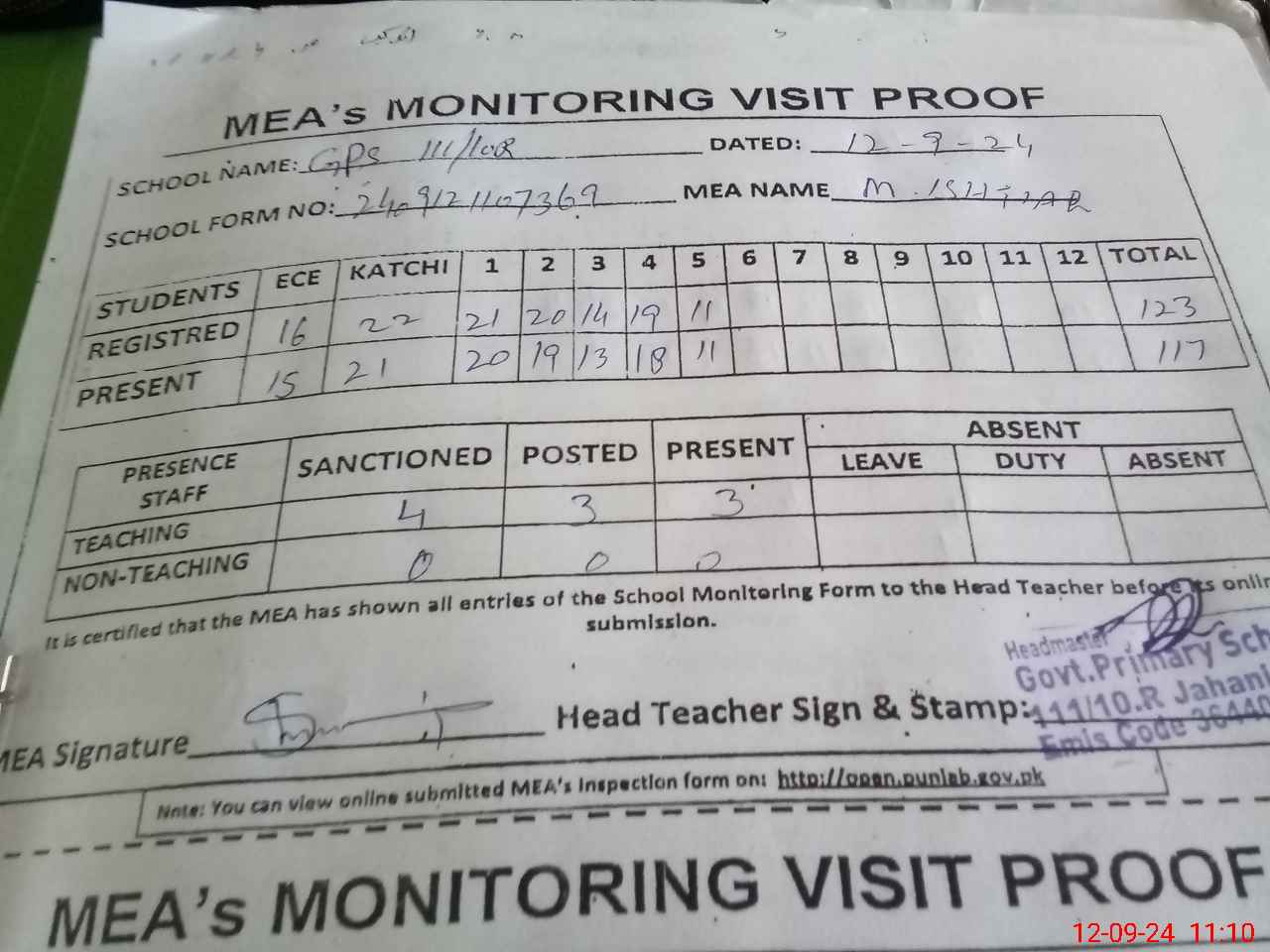 | Attendance Register | Head Teacher | MEA with School | Visit Proof |