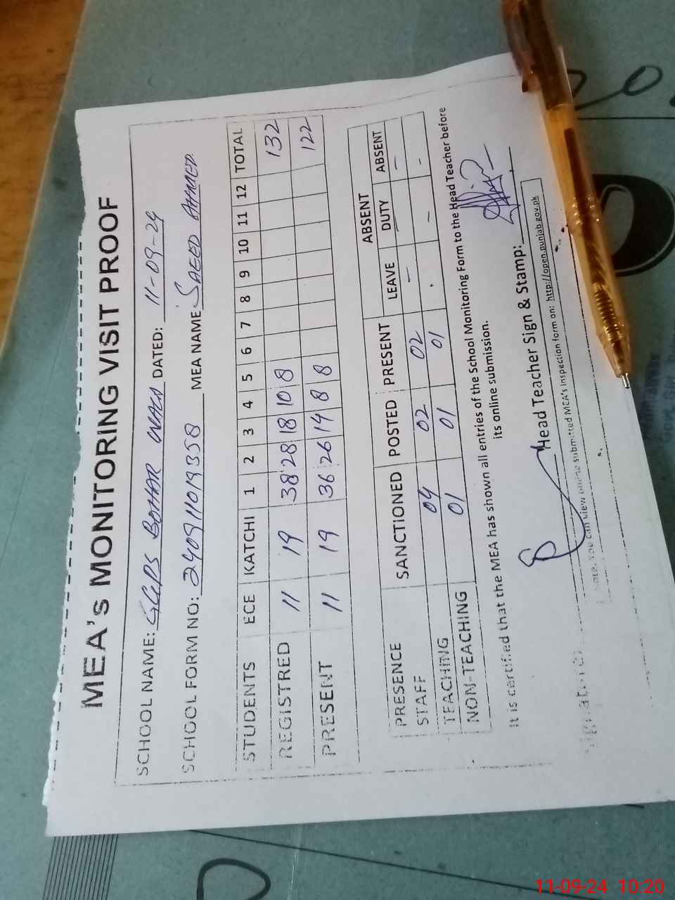 | Attendance Register | Head Teacher | MEA with School | Visit Proof |