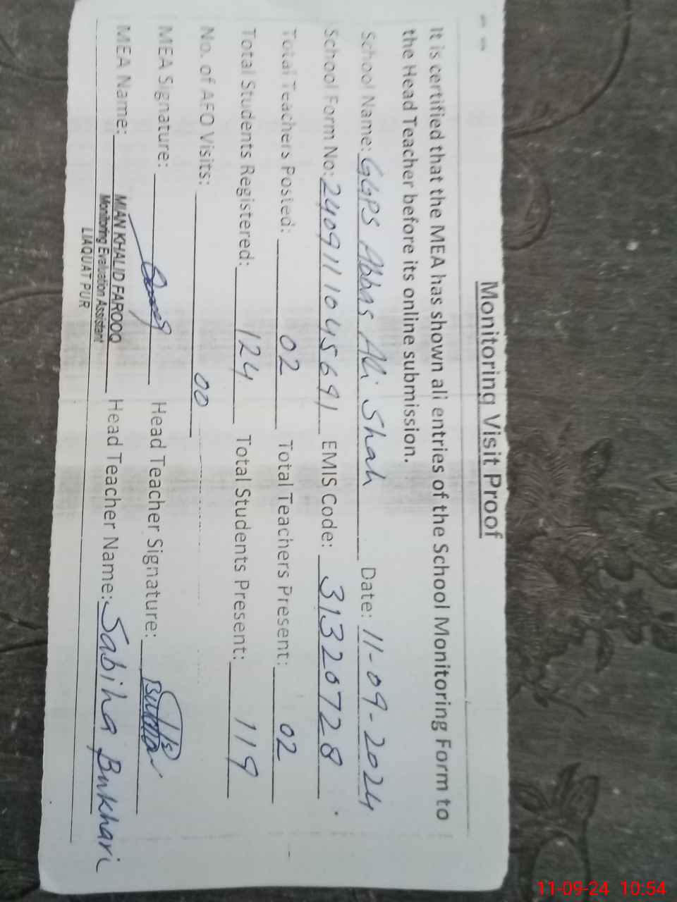 | Attendance Register | Head Teacher | MEA with School | Visit Proof |