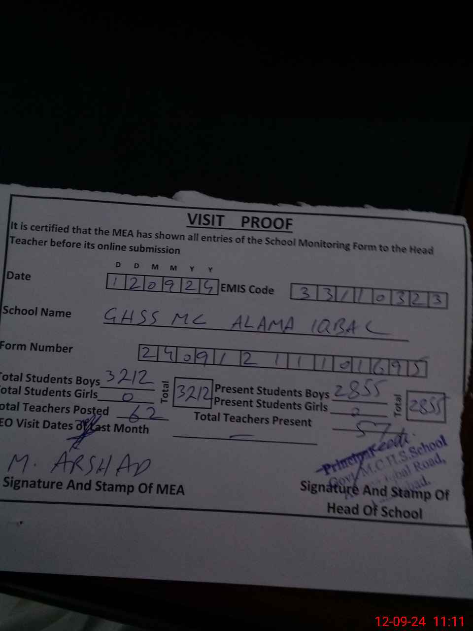 | Attendance Register | Head Teacher | MEA with School | Visit Proof |