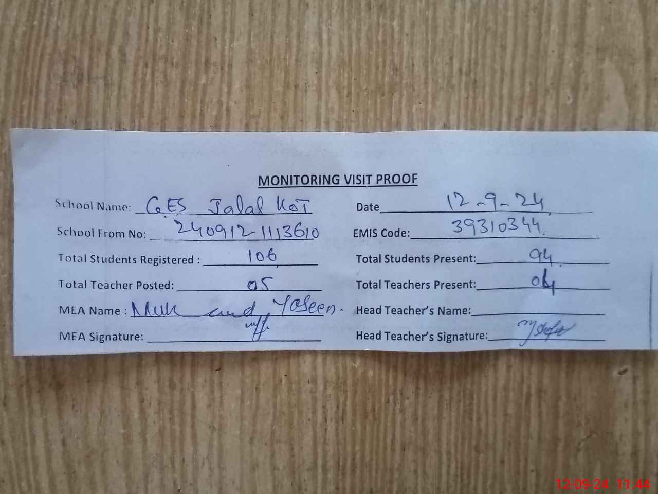 | Attendance Register | Head Teacher | MEA with School | Visit Proof |