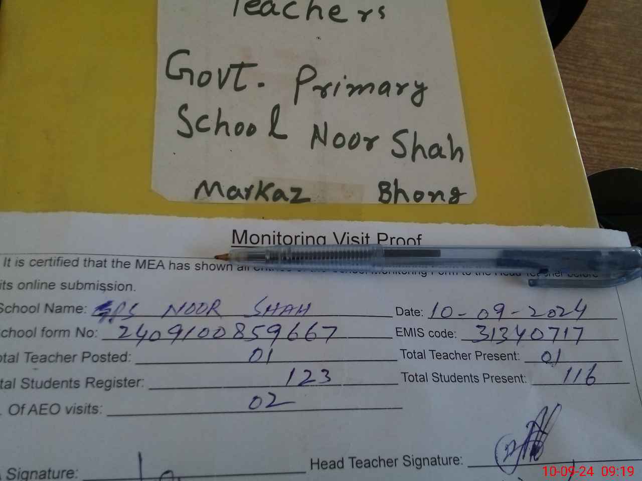 | Attendance Register | Head Teacher | MEA with School | Visit Proof |