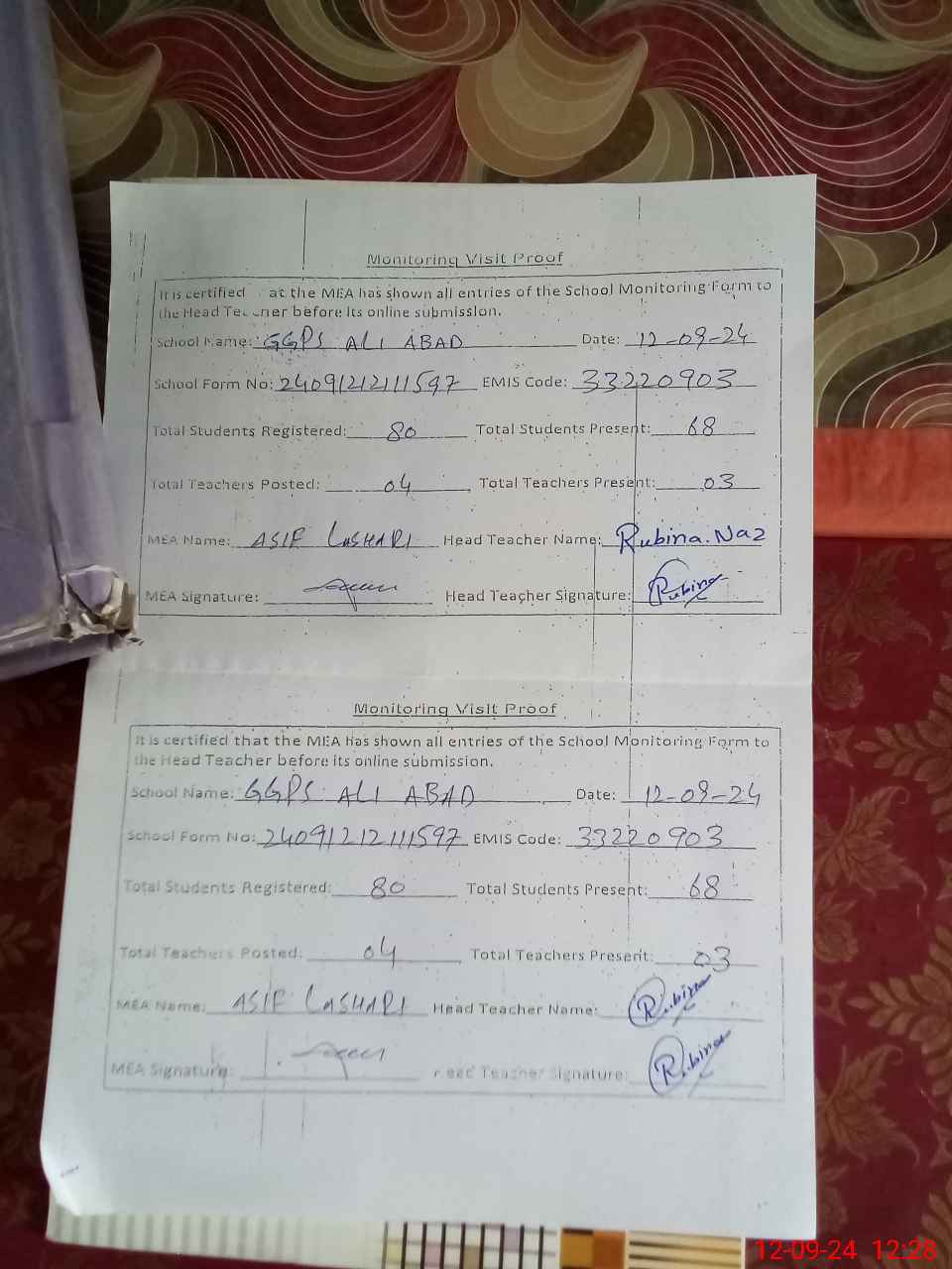 | Attendance Register | Head Teacher | MEA with School | Visit Proof |