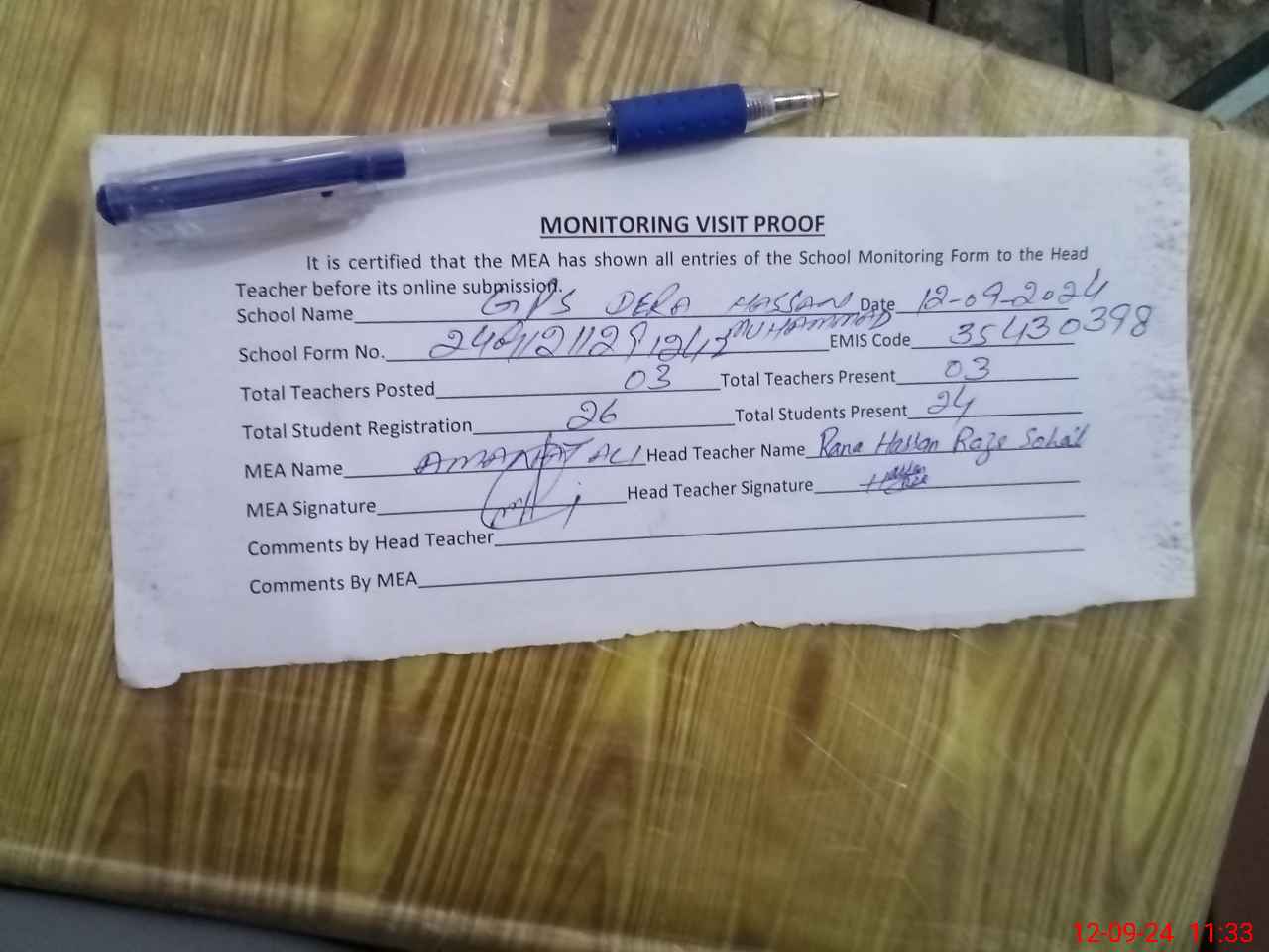 | Attendance Register | Head Teacher | MEA with School | Visit Proof |