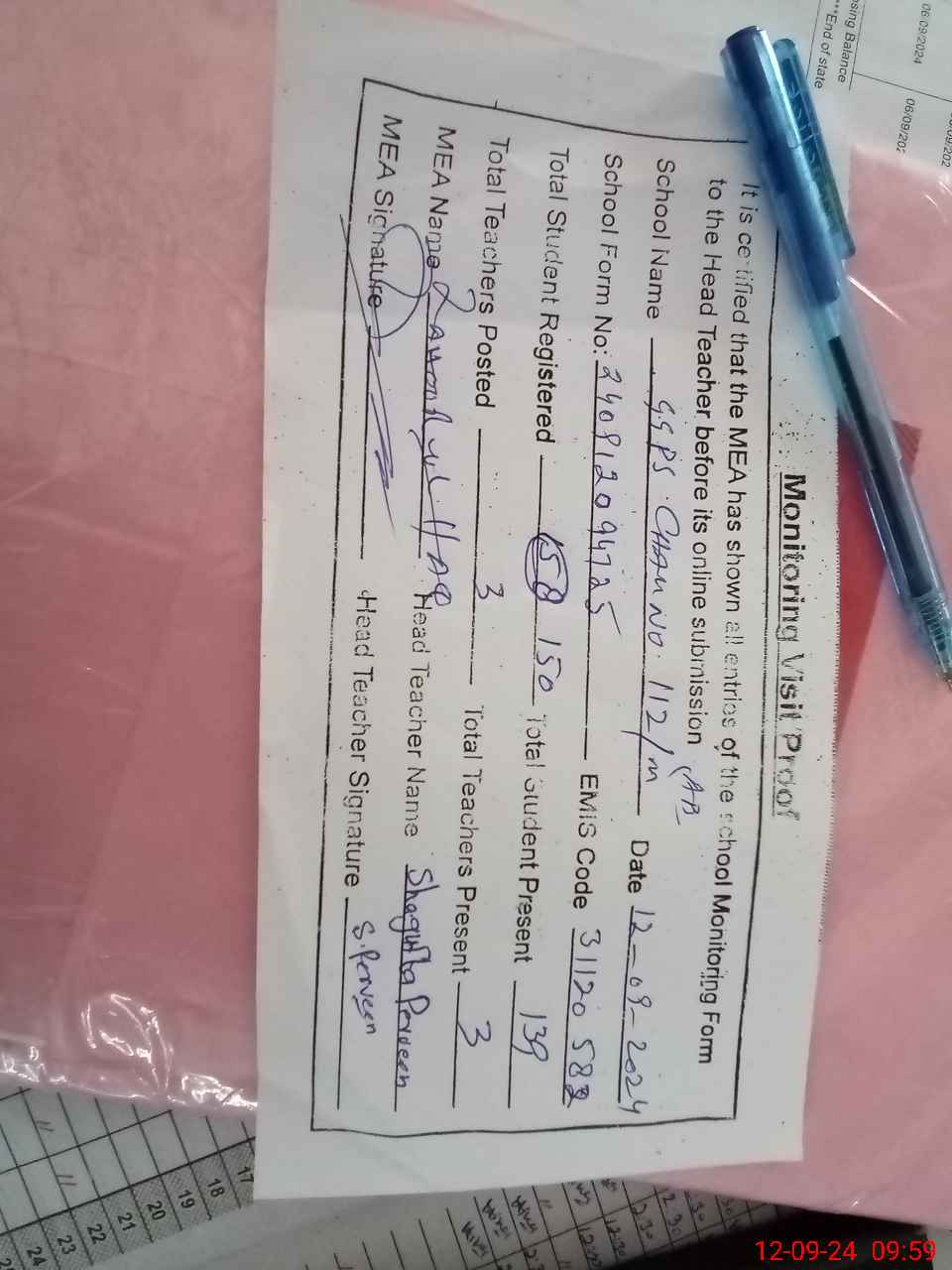 | Monitoring Date: 12-09-2024 | Start Time: 12-09-2024 09:33 AM | End Time: 12-09-2024 10:00 AM | Name of MEA: Za**** BN**** | |