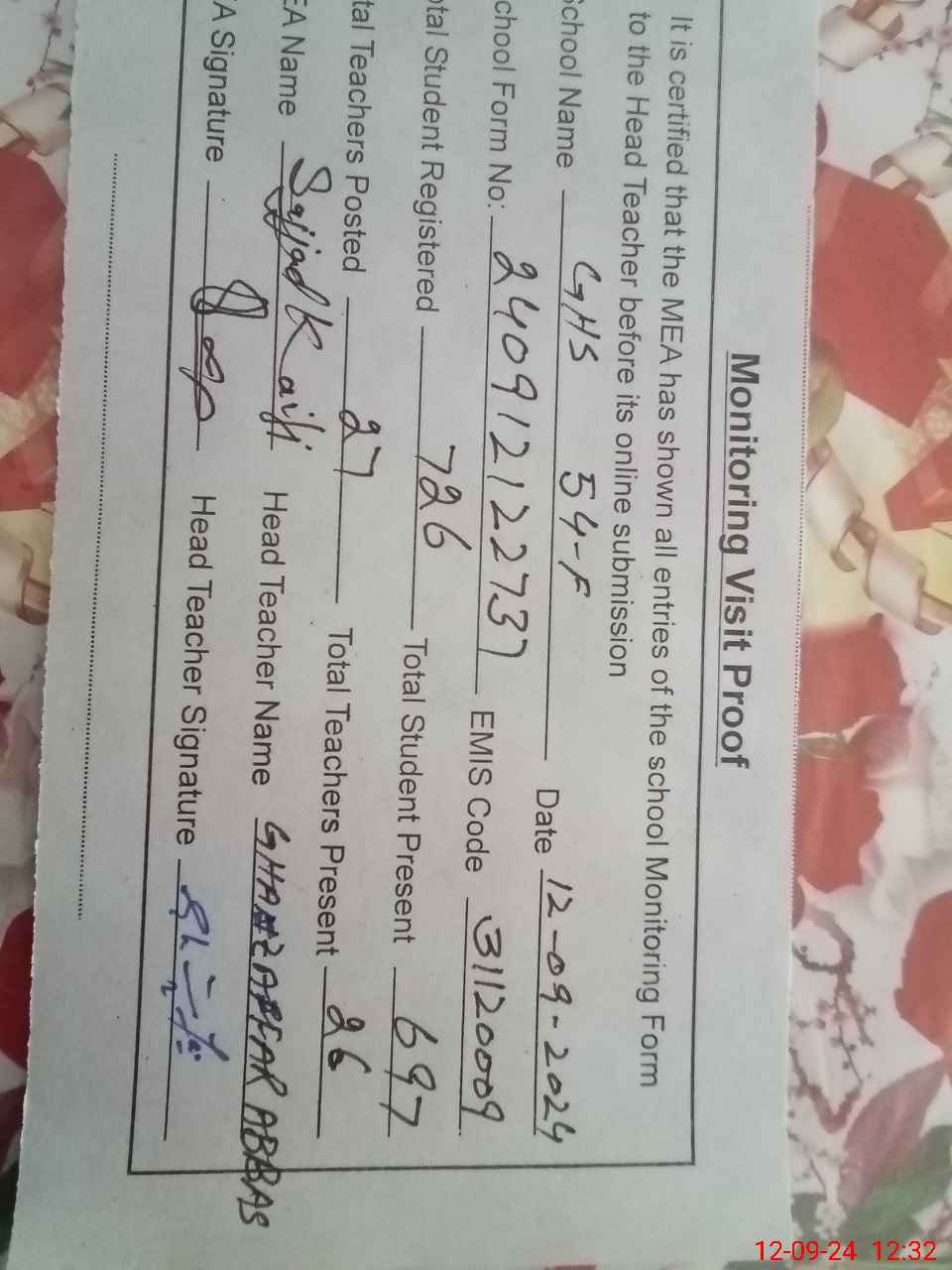 | EMIS Code: 31120009 | Name of School: GHS CHAK NO. 54/F | |||