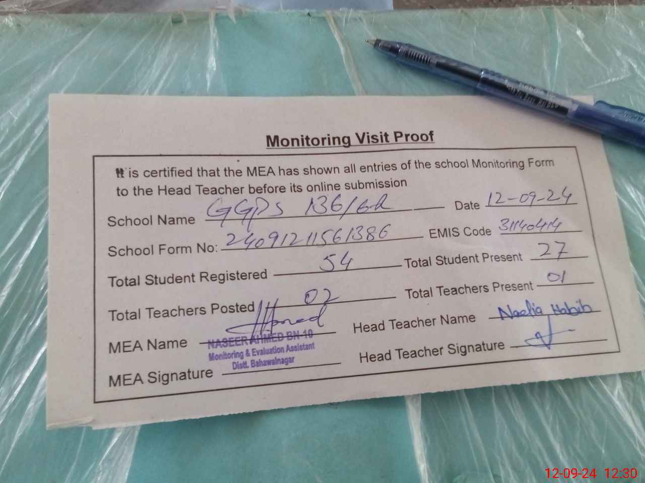 | Attendance Register | Head Teacher | MEA with School | Visit Proof |