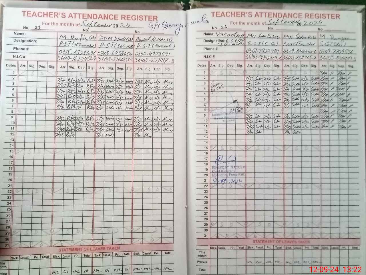 | CNIC | Full Name | Designation | R/C | Absence during last cal. month |