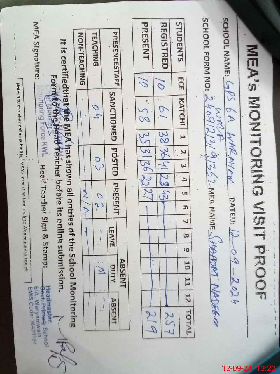 | Attendance Register | Head Teacher | MEA with School | Visit Proof |