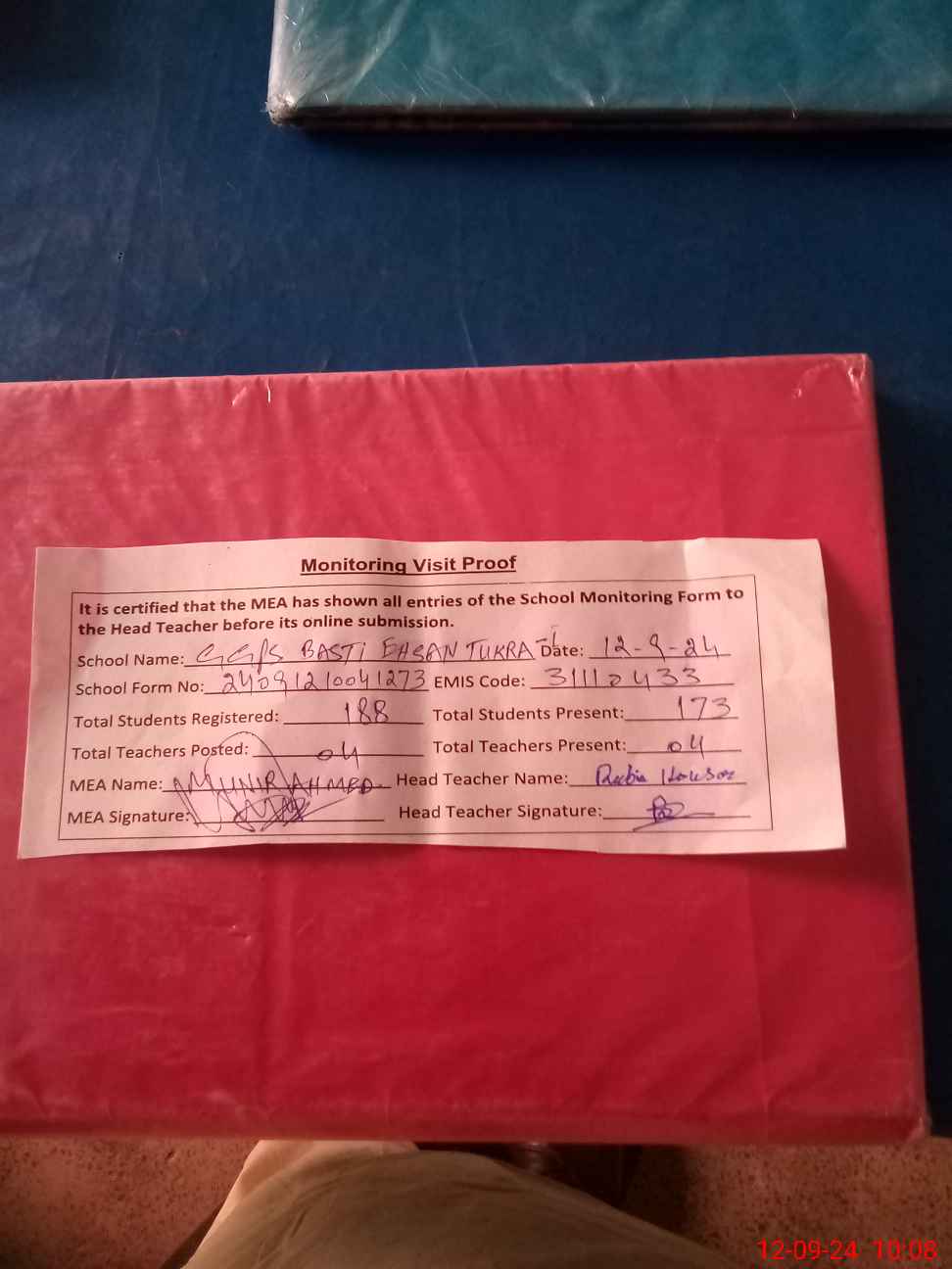 | Attendance Register | Head Teacher | MEA with School | Visit Proof |