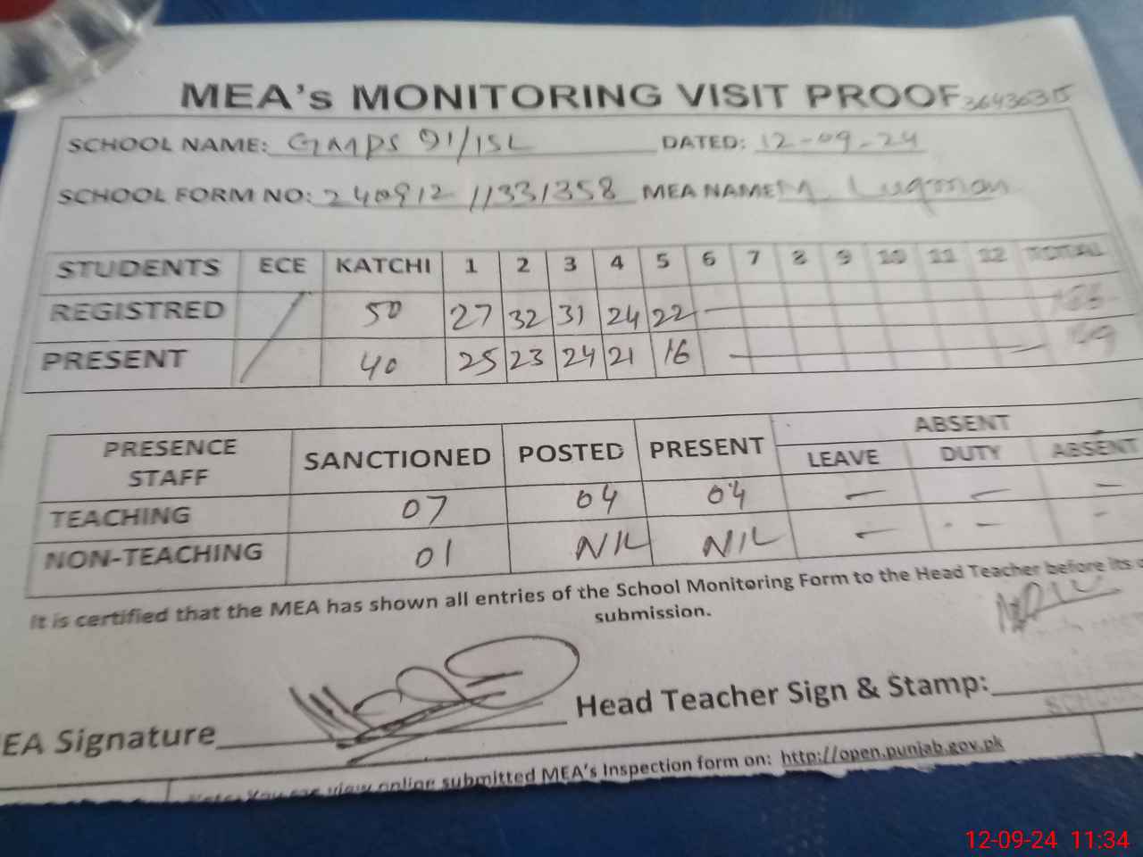 | Attendance Register | Head Teacher | MEA with School | Visit Proof |