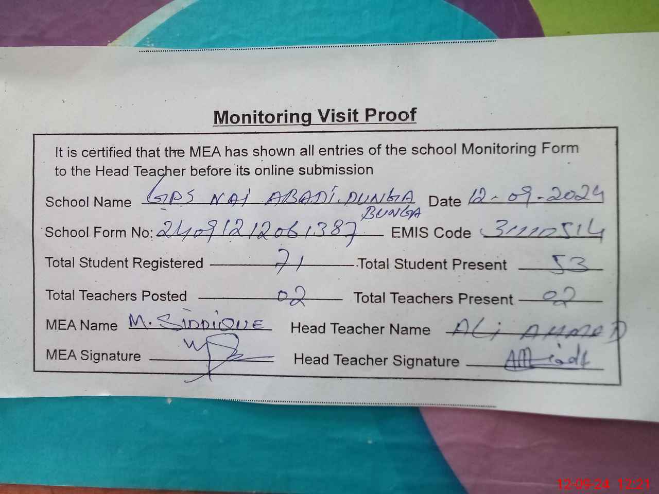 | Attendance Register | Head Teacher | MEA with School | Visit Proof |