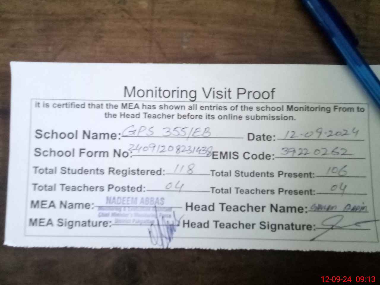 | Attendance Register | Head Teacher | MEA with School | Visit Proof |