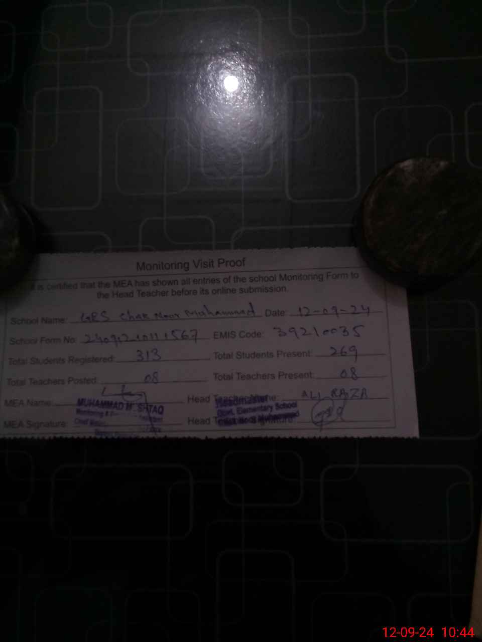 | Attendance Register | Head Teacher | MEA with School | Visit Proof |