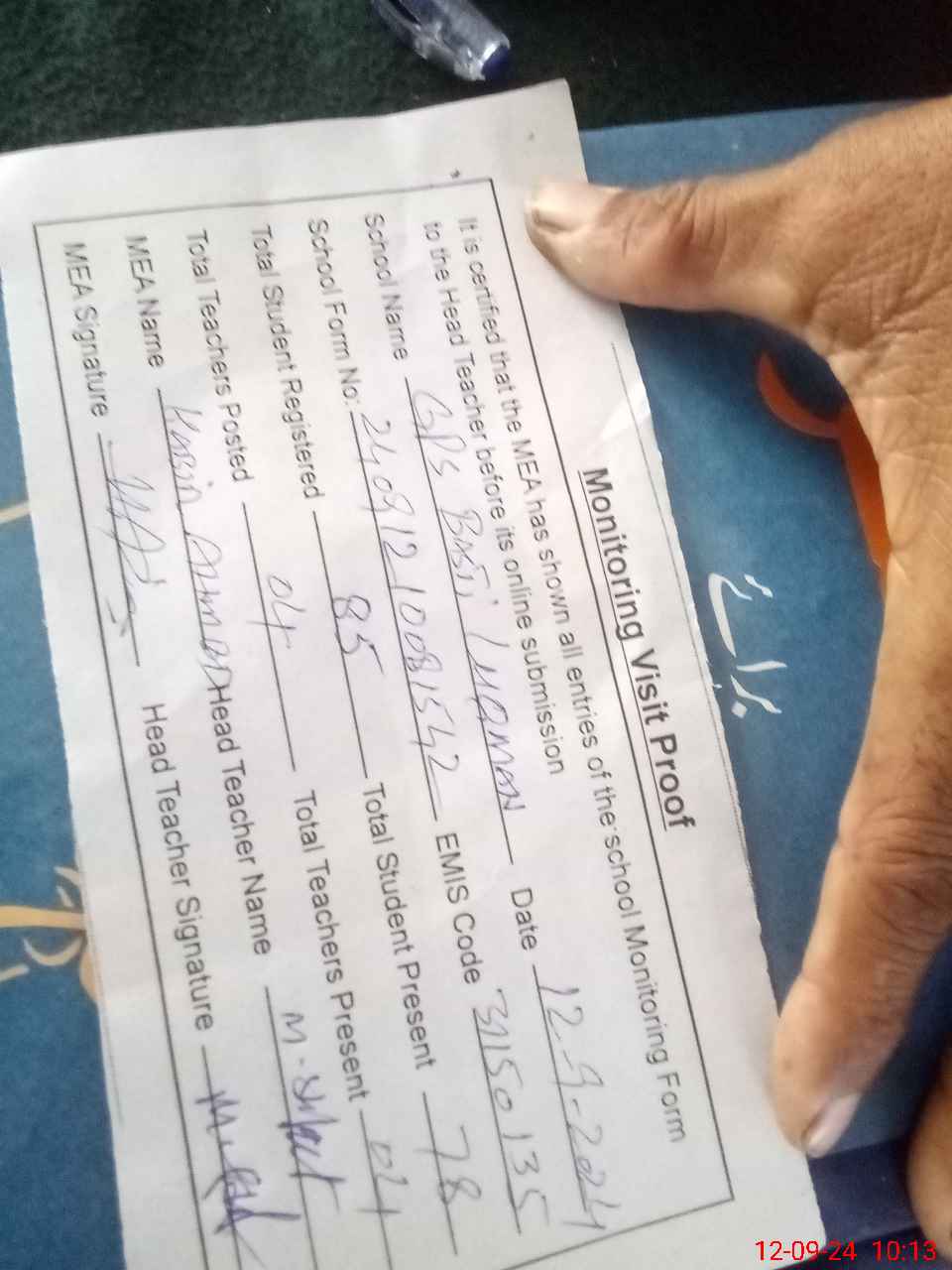 | Attendance Register | Head Teacher | MEA with School | Visit Proof |