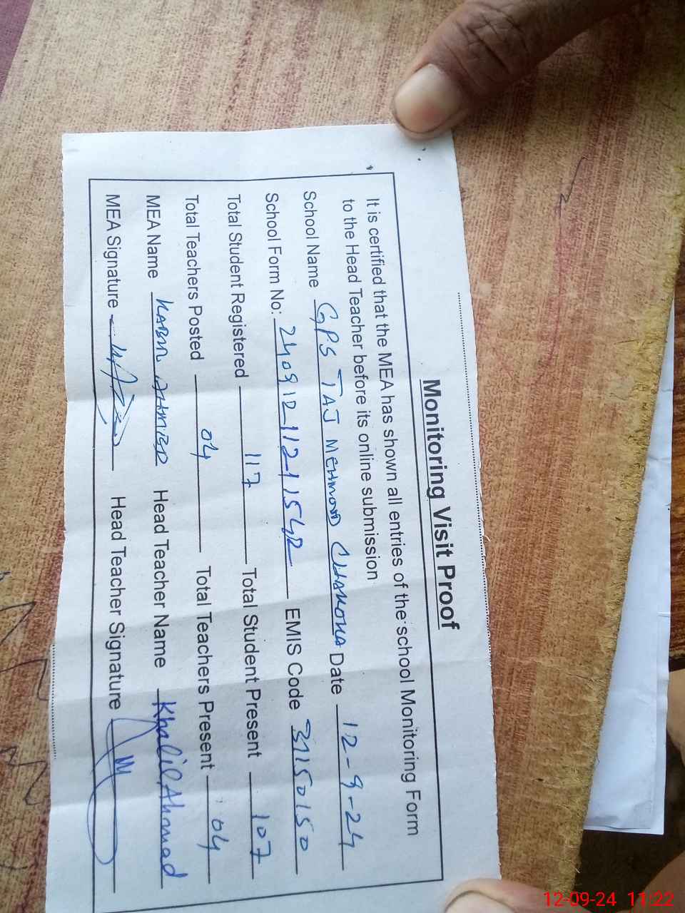 | Attendance Register | Head Teacher | MEA with School | Visit Proof |