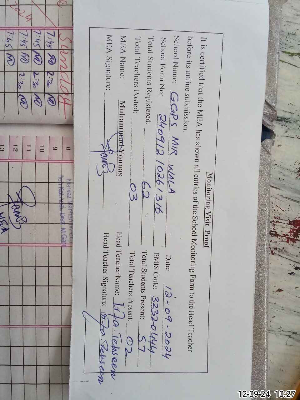 | EMIS Code: 32320444 | Name of School: GGPS MIR WALA | |||