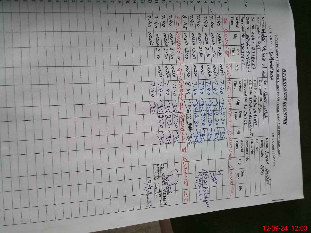 | CNIC | Full Name | Designation | R/C | Absence during last cal. month |