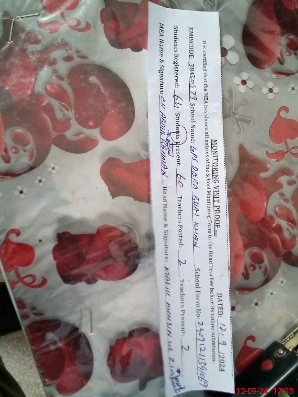 | Attendance Register | Head Teacher | MEA with School | Visit Proof |
