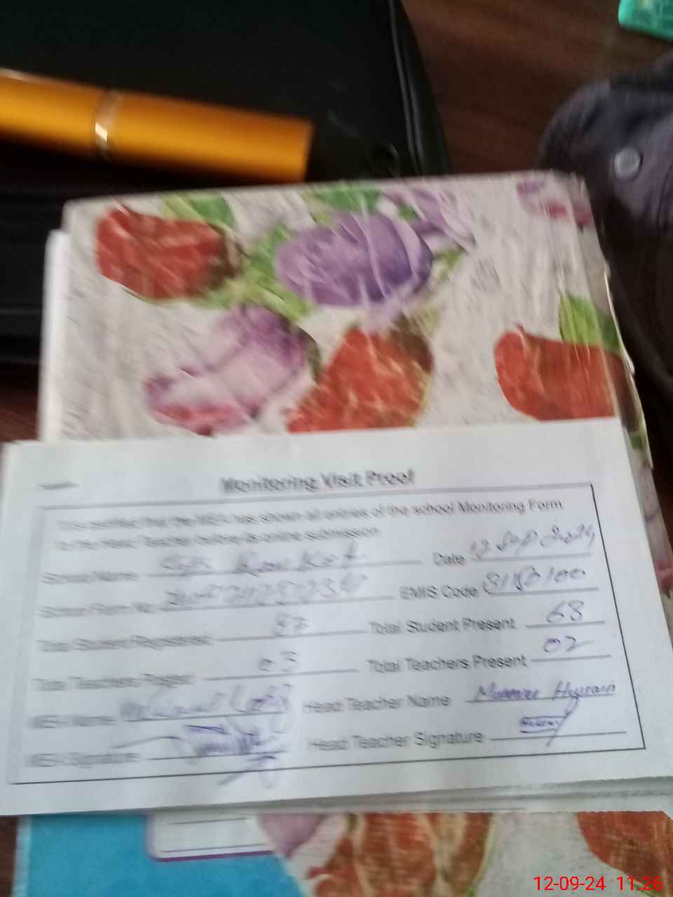 | Attendance Register | Head Teacher | MEA with School | Visit Proof |