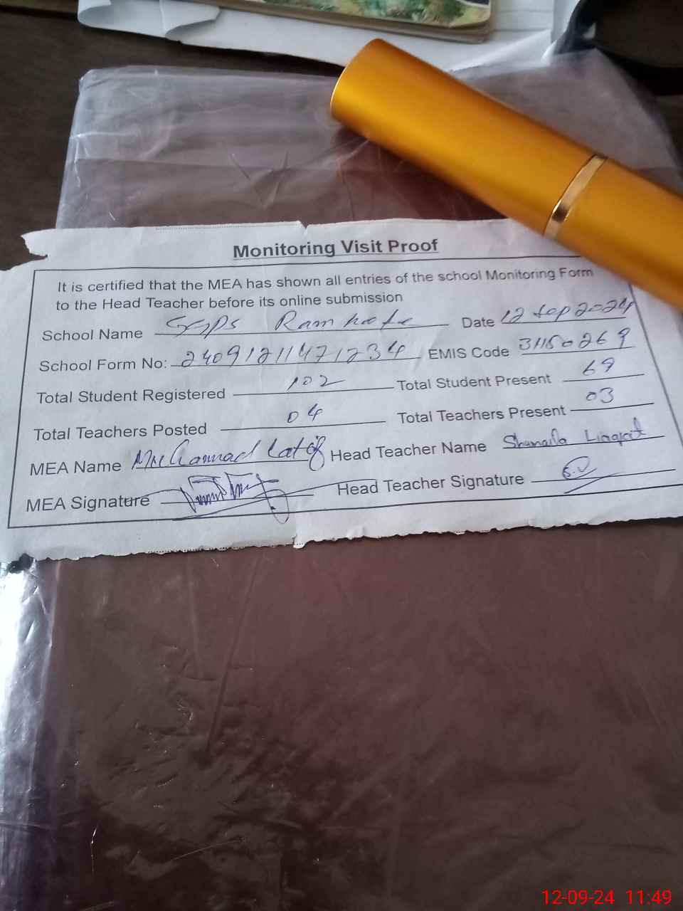 | Attendance Register | Head Teacher | MEA with School | Visit Proof |