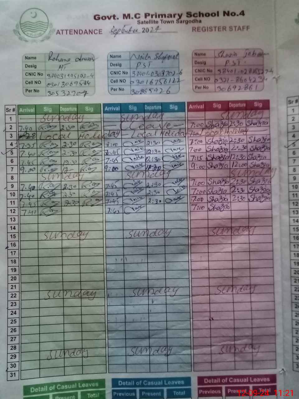 | CNIC | Full Name | Designation | R/C | Absence During Last Calender Month |