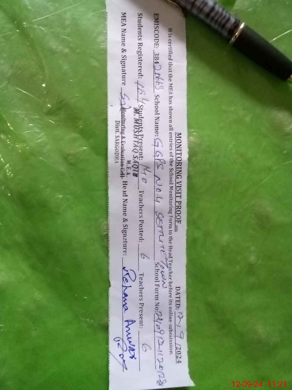 | Attendance Register | Head Teacher | MEA with School | Visit Proof |