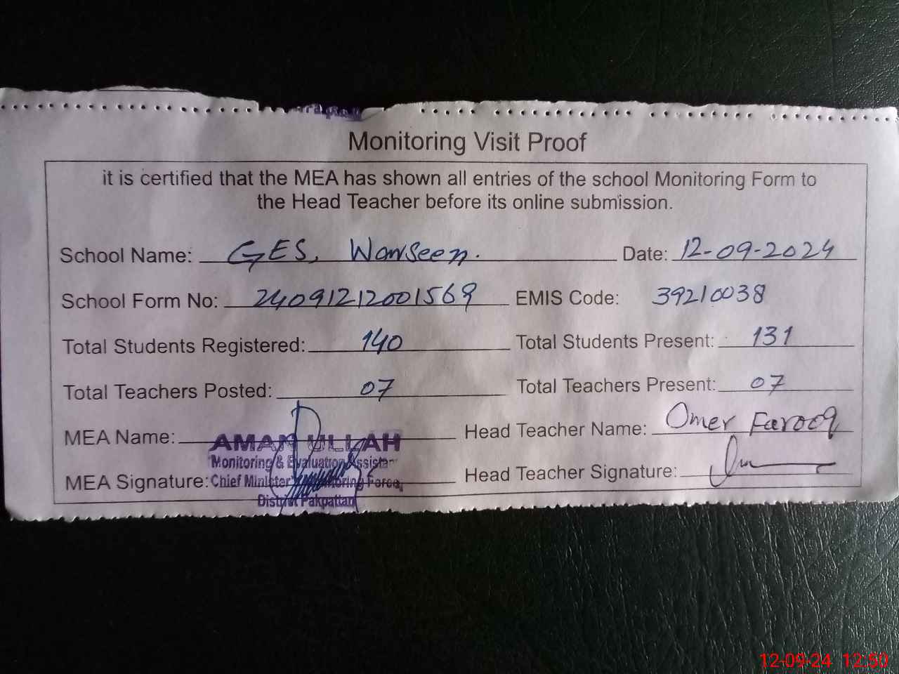 | Attendance Register | Head Teacher | MEA with School | Visit Proof |