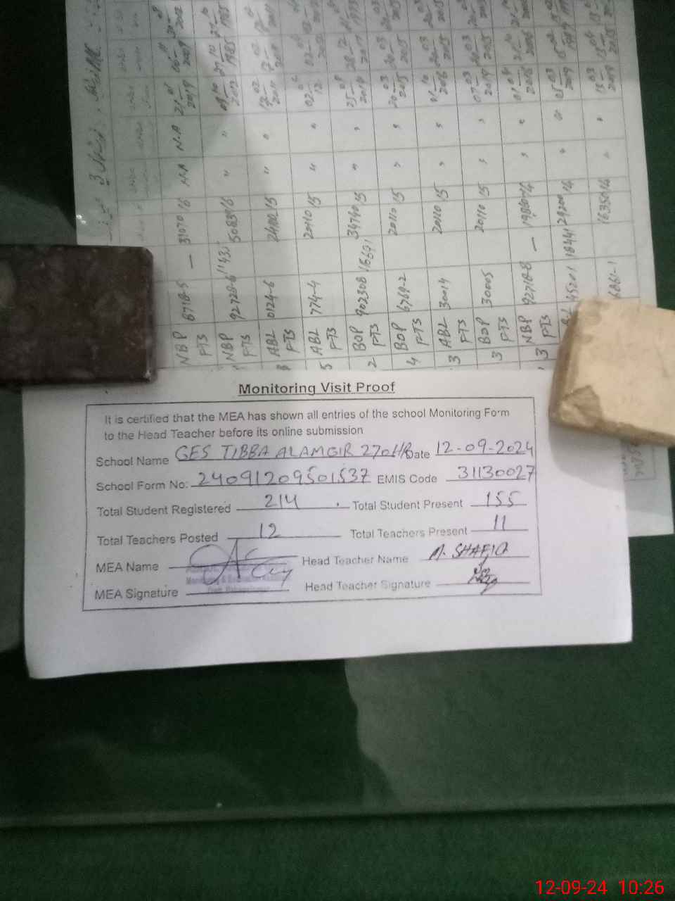 | Attendance Register | Head Teacher | MEA with School | Visit Proof |