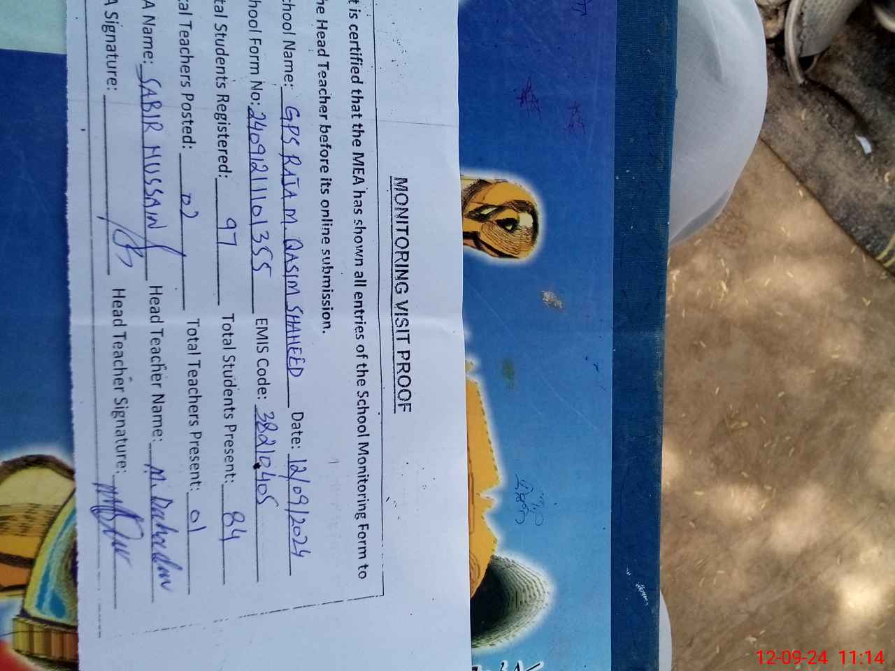 | Attendance Register | Head Teacher | MEA with School | Visit Proof |