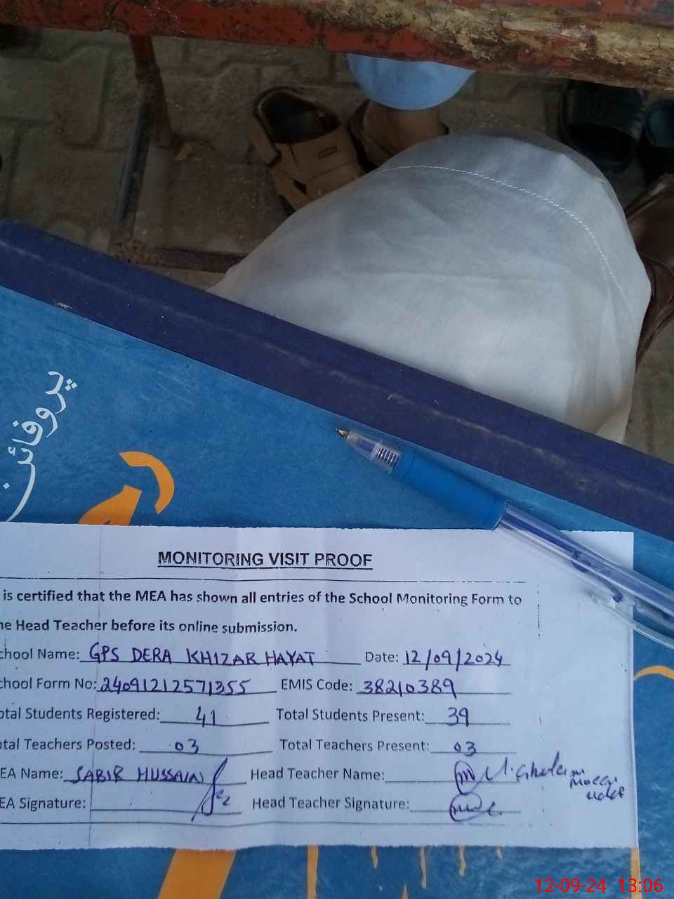 | EMIS Code: 38210389 | Name of School: GPS DERA KHIZAR HAYAT | |||