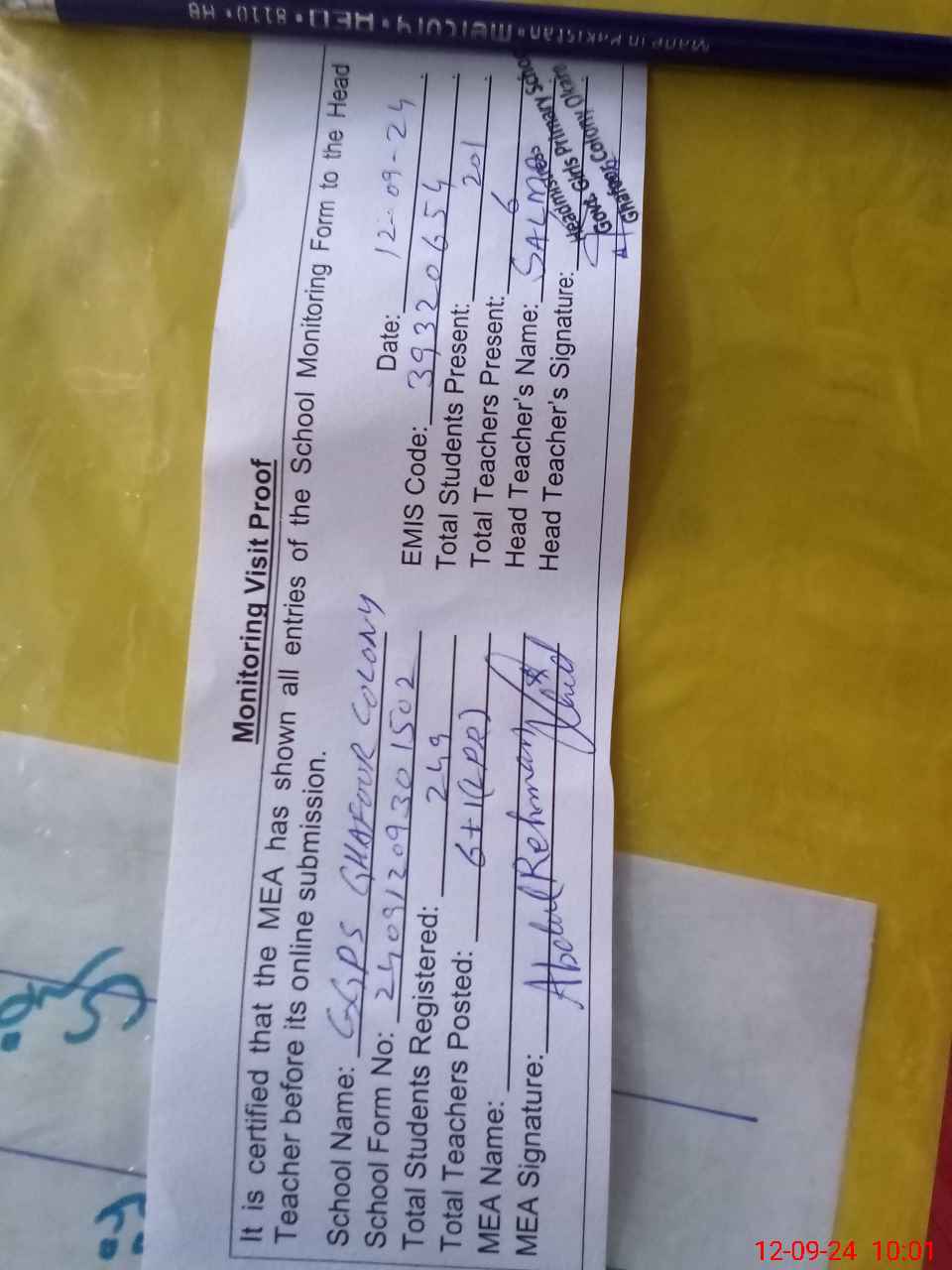 | Attendance Register | Head Teacher | MEA with School | Visit Proof |