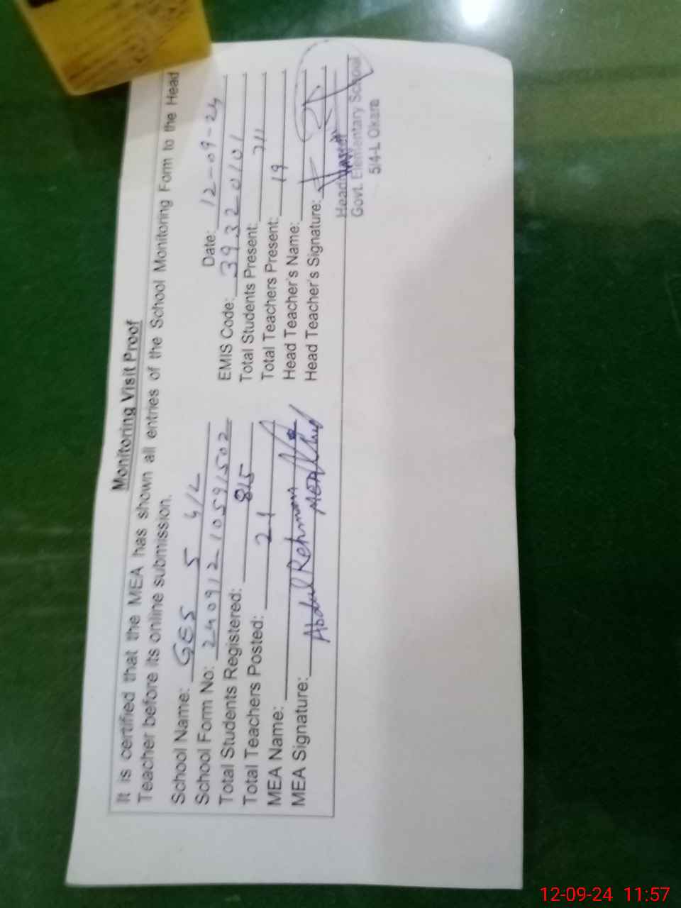 | Attendance Register | Head Teacher | MEA with School | Visit Proof |