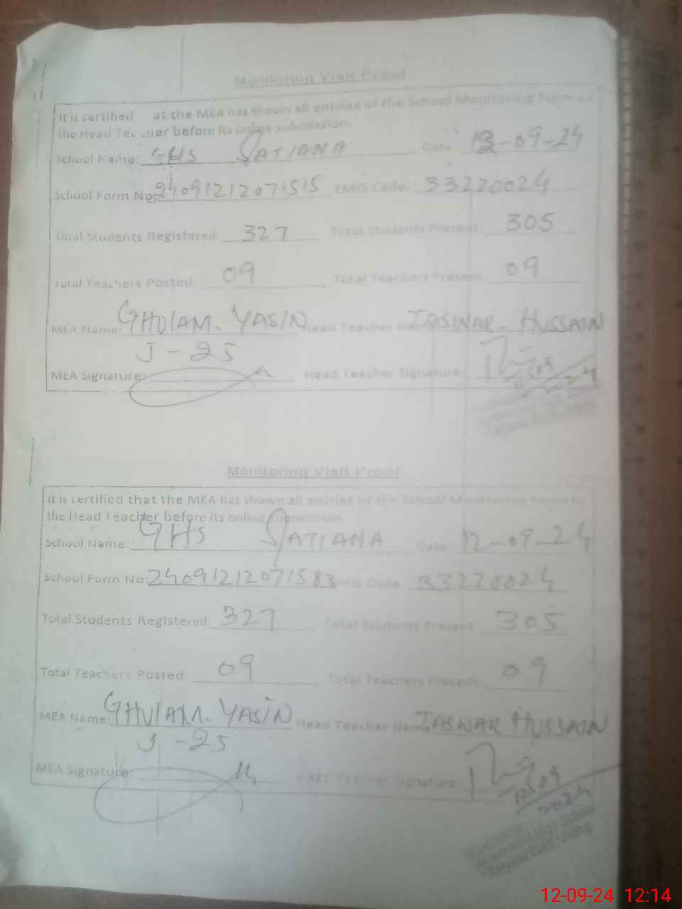 | Monitoring Date: 12-09-2024 | Start Time: 12-09-2024 11:14 AM | End Time: 12-09-2024 12:22 PM | Name of MEA: J-**** GH**** YA**** | |