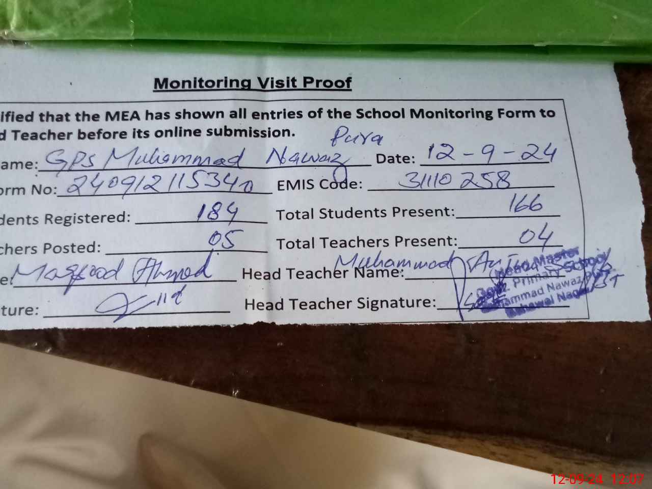| Attendance Register | Head Teacher | MEA with School | Visit Proof |