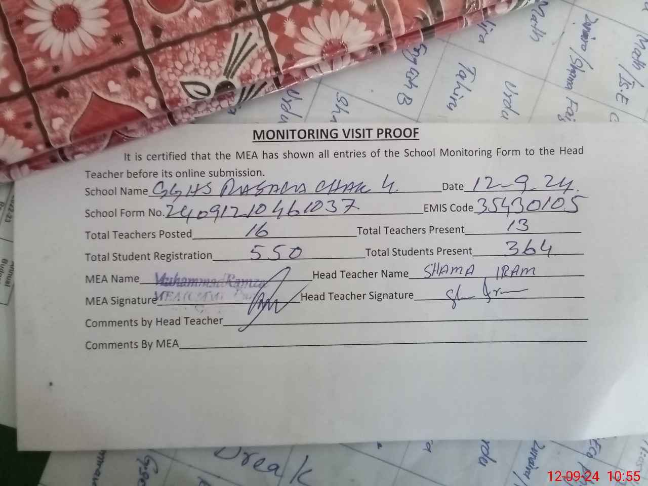 | Attendance Register | Head Teacher | MEA with School | Visit Proof |