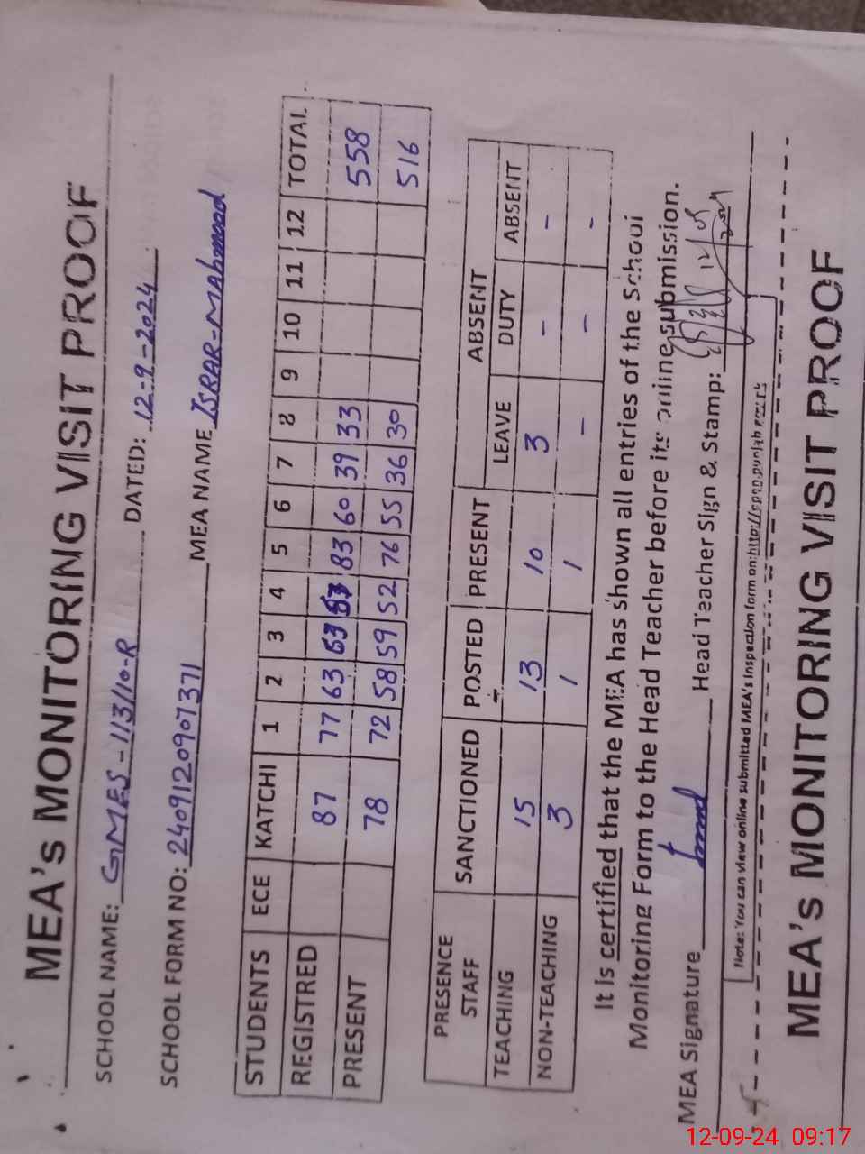 | Attendance Register | Head Teacher | MEA with School | Visit Proof |