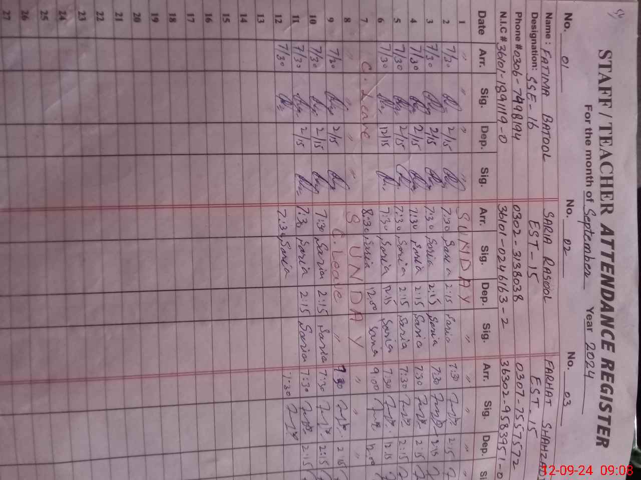 | CNIC | Full Name | Designation | R/C | Absence during last cal. month |