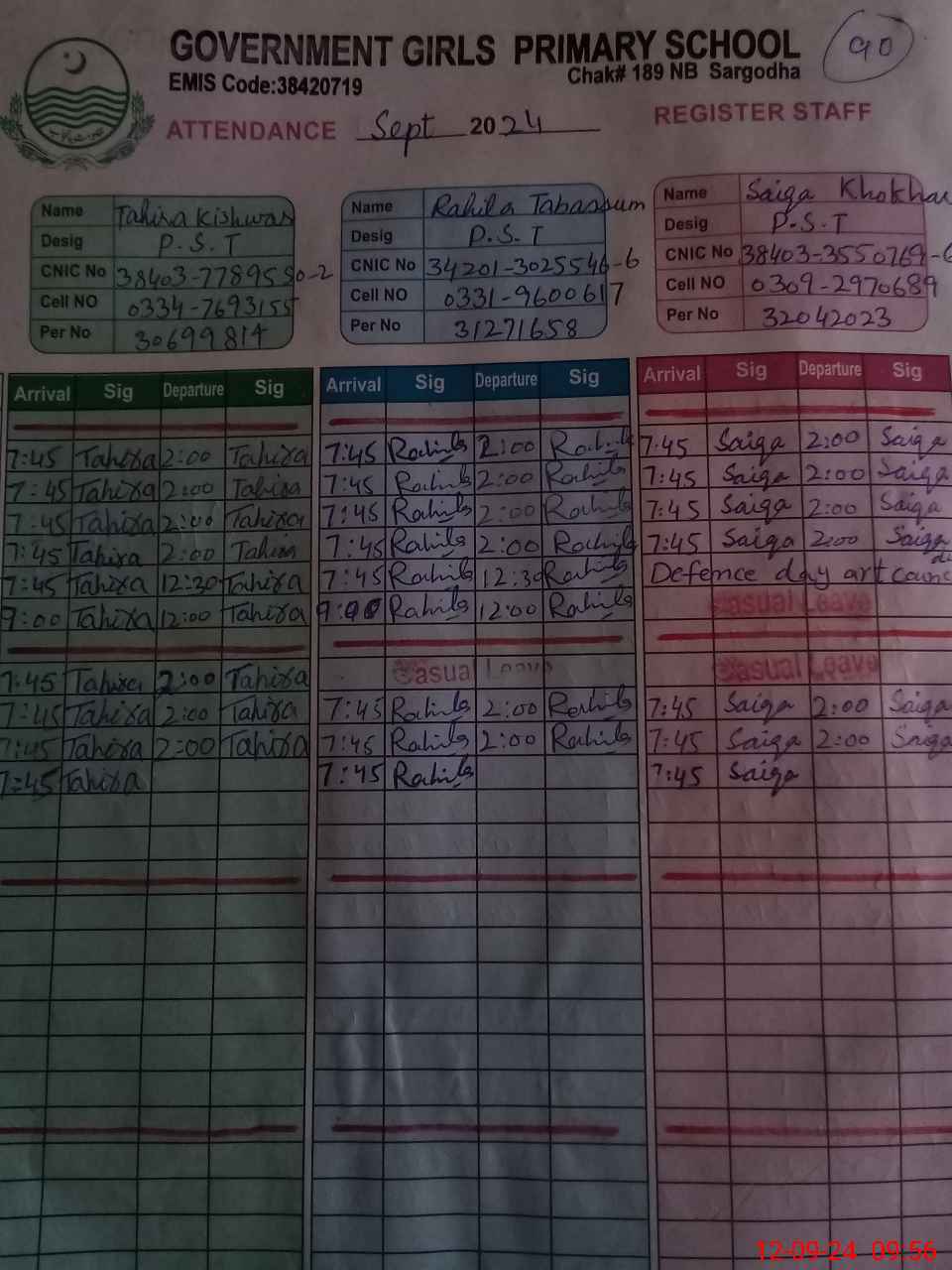 | CNIC | Full Name | Designation | R/C | Absence During Last Calender Month |