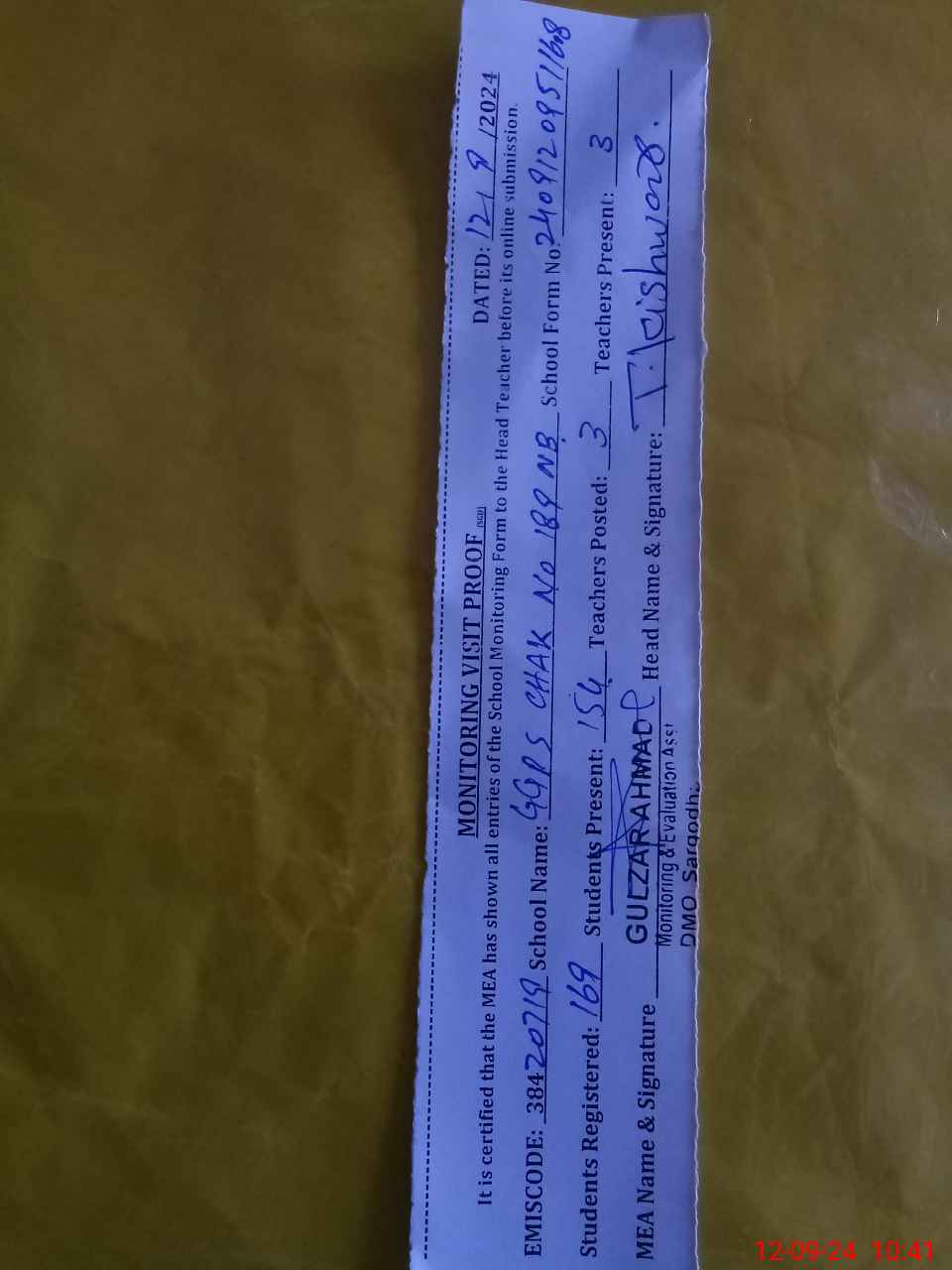 | Attendance Register | Head Teacher | MEA with School | Visit Proof |