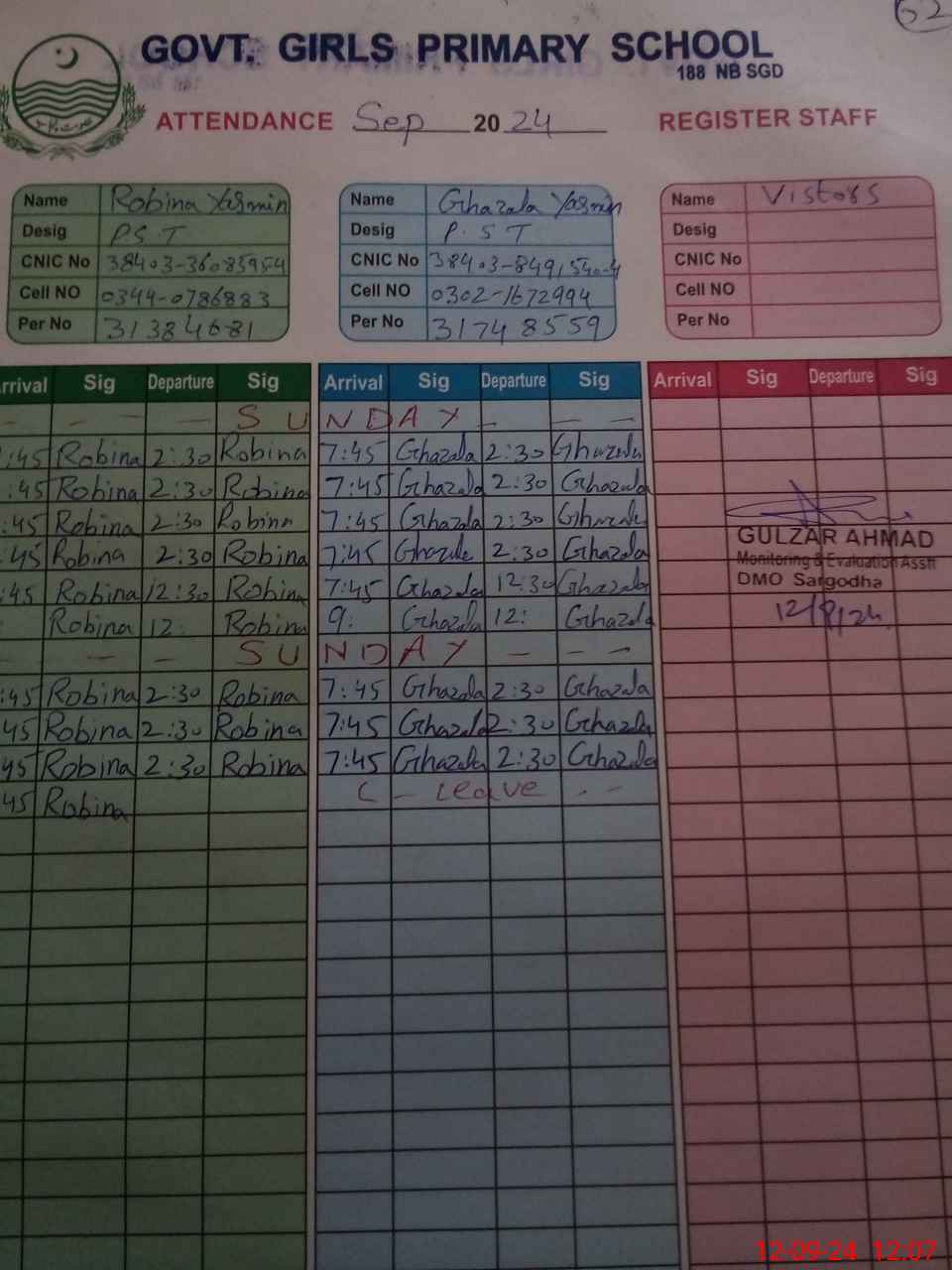 | CNIC | Full Name | Designation | R/C | Absence During Last Calender Month |