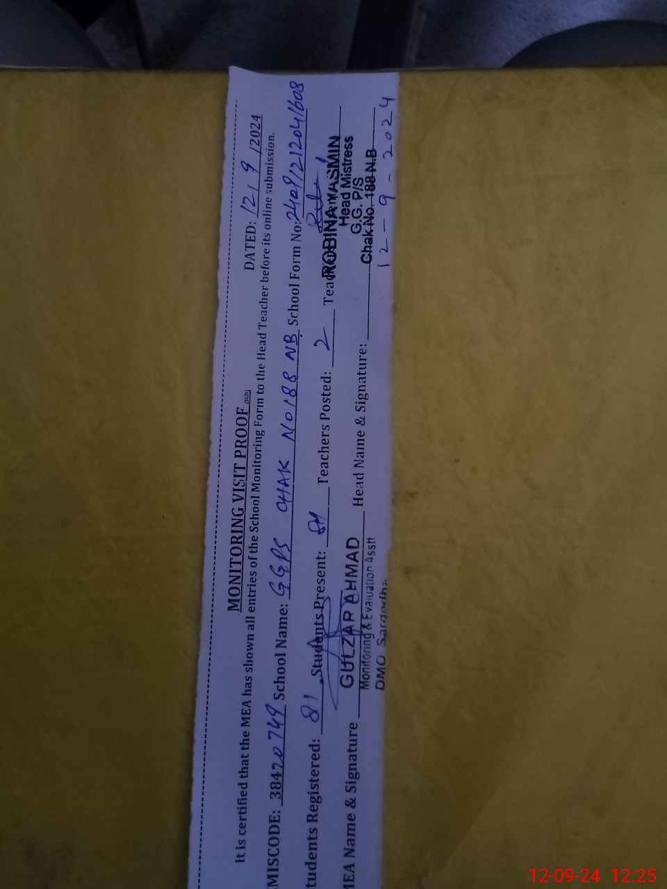 | Attendance Register | Head Teacher | MEA with School | Visit Proof |