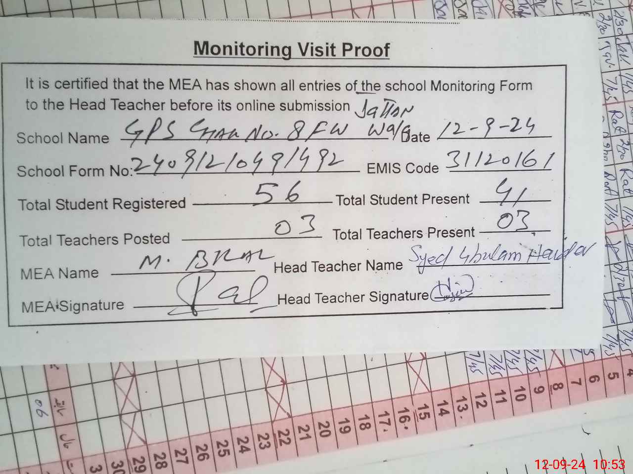 | Attendance Register | Head Teacher | MEA with School | Visit Proof |