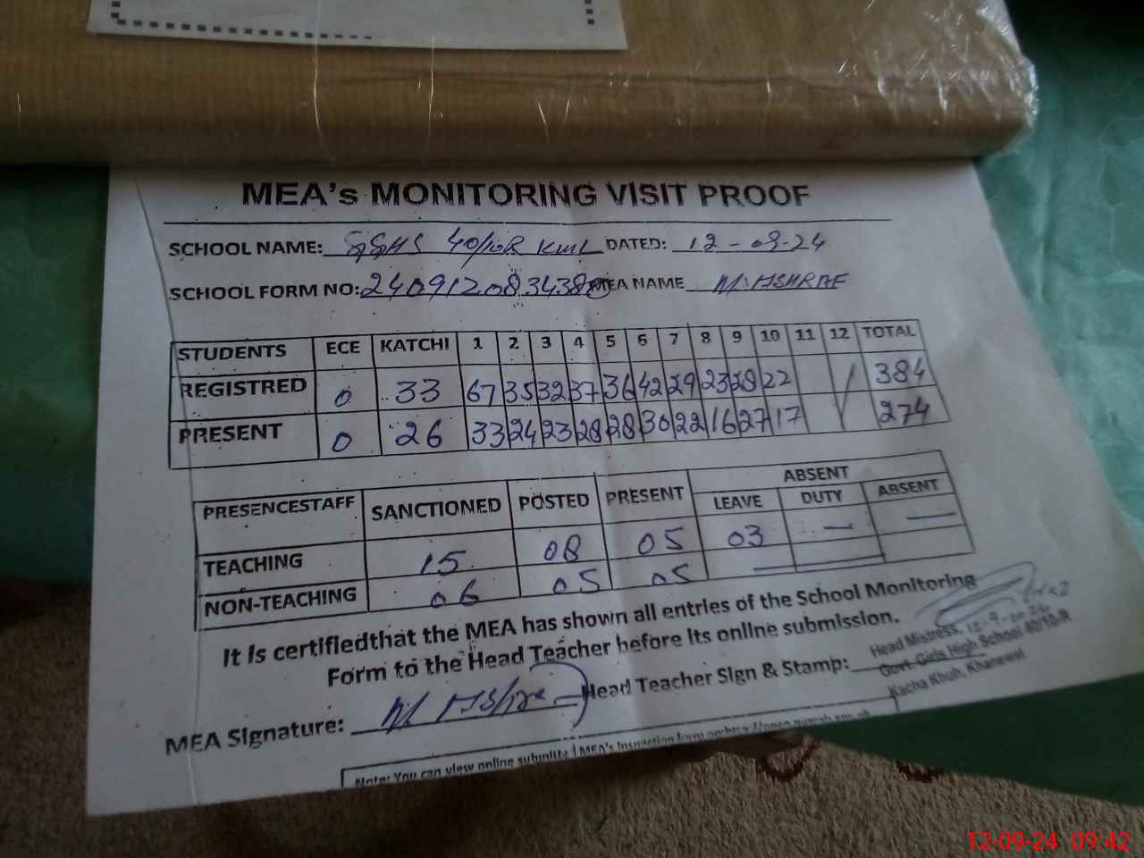 | Attendance Register | Head Teacher | MEA with School | Visit Proof |