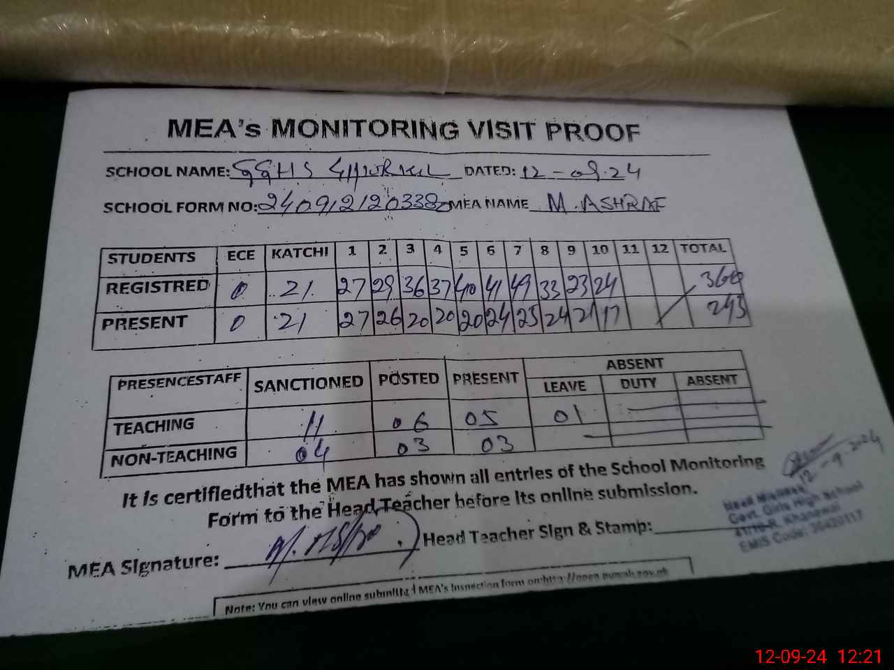 | Attendance Register | Head Teacher | MEA with School | Visit Proof |