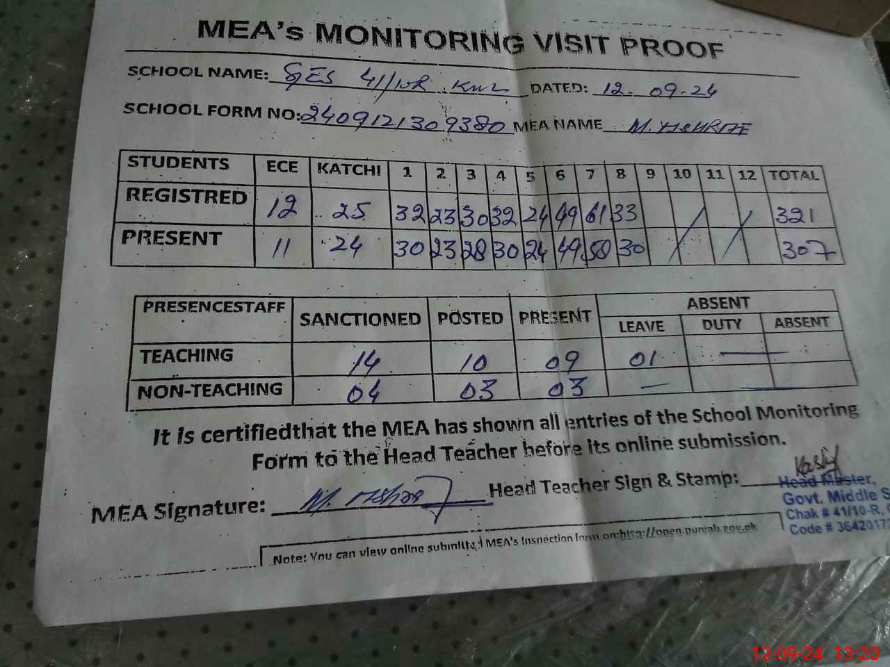 | Attendance Register | Head Teacher | MEA with School | Visit Proof |