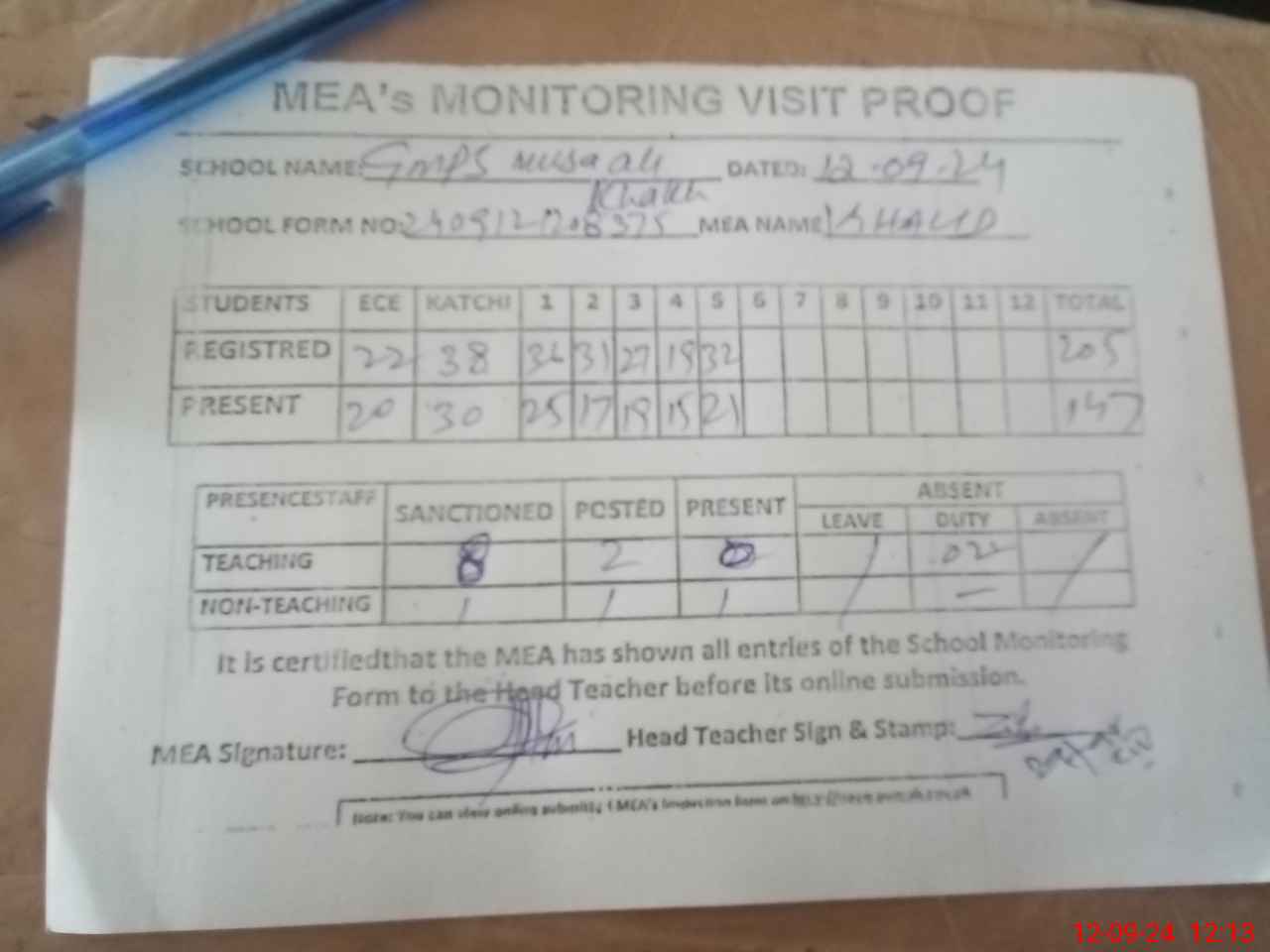 | Attendance Register | Head Teacher | MEA with School | Visit Proof |