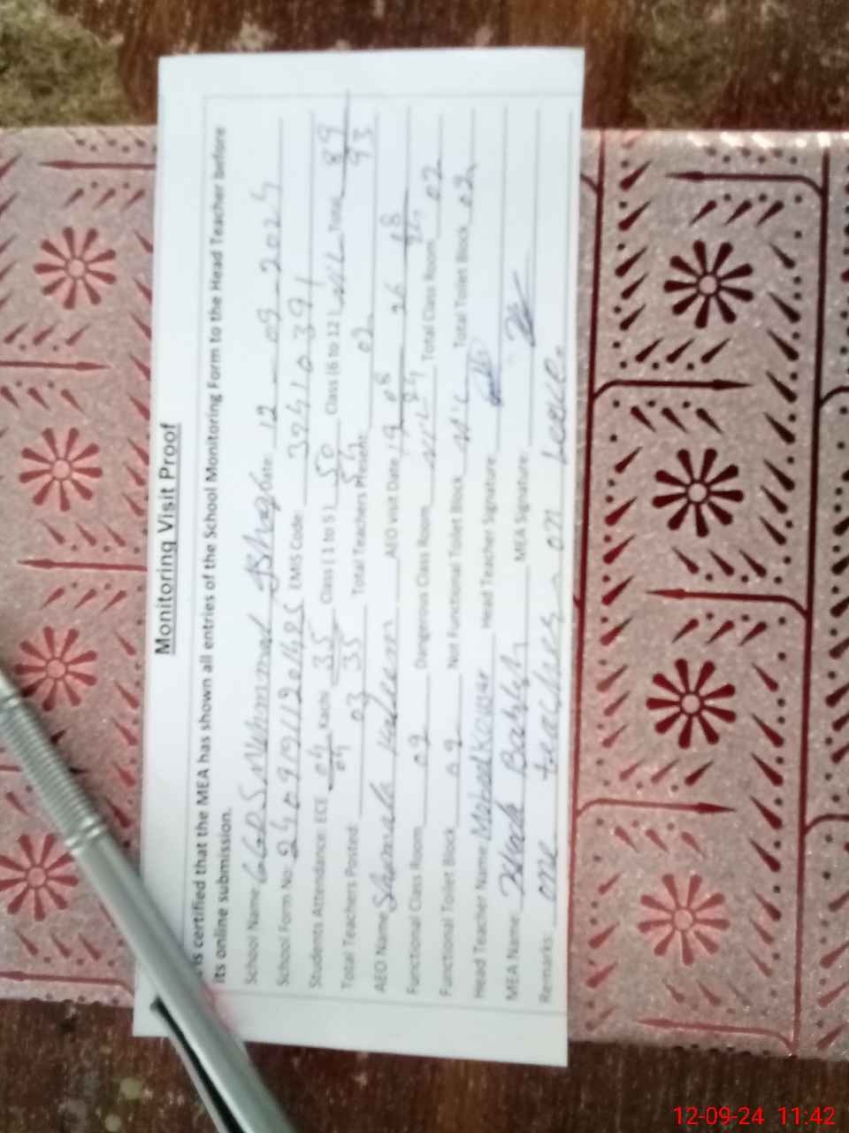| Attendance Register | Head Teacher | MEA with School | Visit Proof |