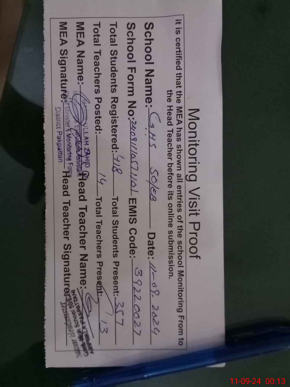 | Attendance Register | Head Teacher | MEA with School | Visit Proof |